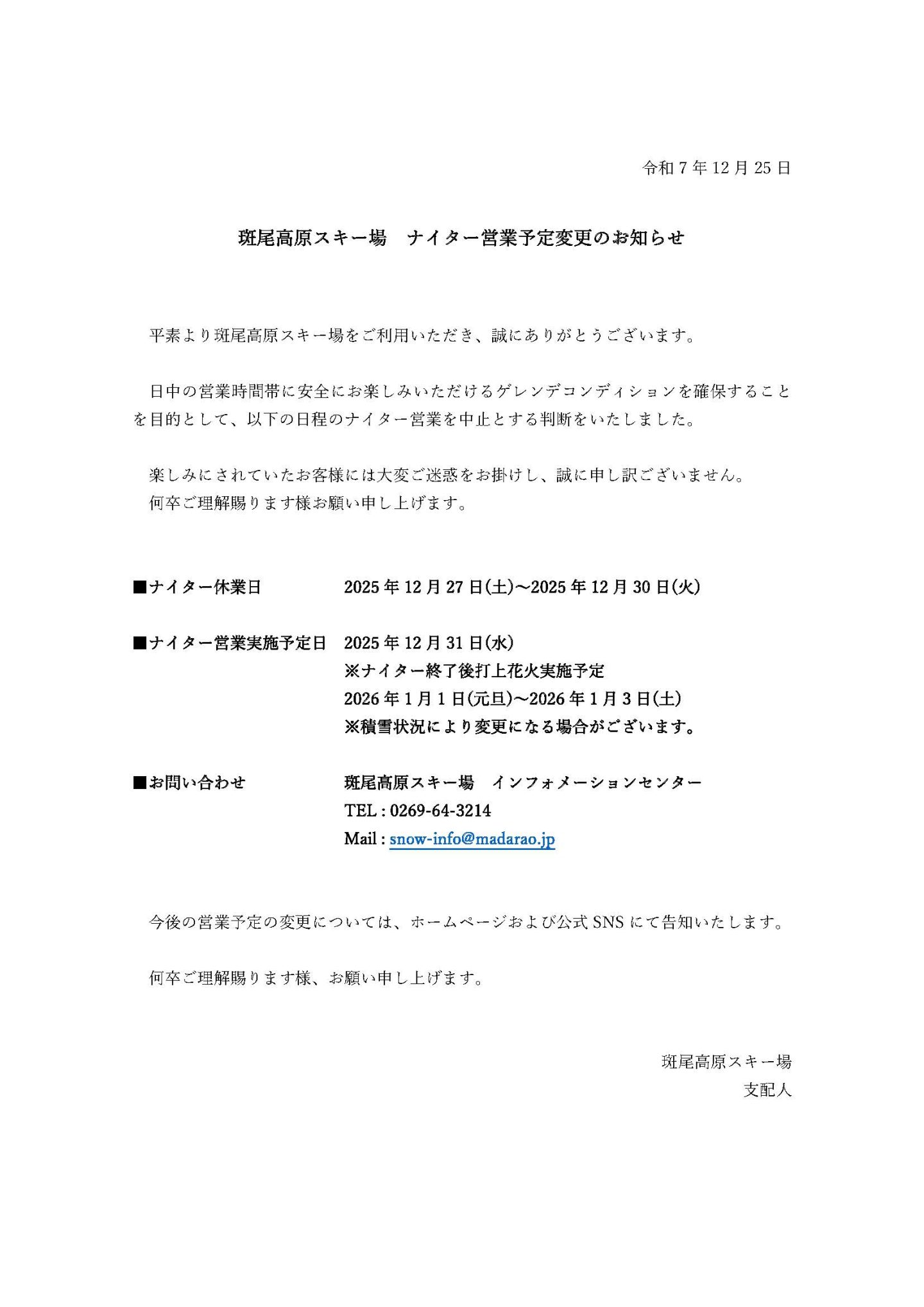 斑尾高原スキー場ナイター営業予定日変更のお知らせ【PDF】