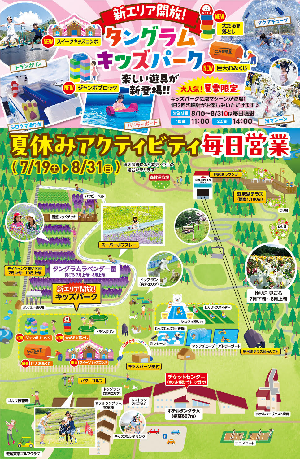 じゃぶじゃぶ池、ふわふわ滑り台、わんぱくスライダー、トランポリン、アクアチューブなど。 キッズが楽しい遊具がいっぱい!入園料制で、各遊具は自由に使えます。 夏は濡れても大丈夫な水着などをお持ちいただくと、より一層楽しめます。 ※季節により種類が変更になる遊具があります