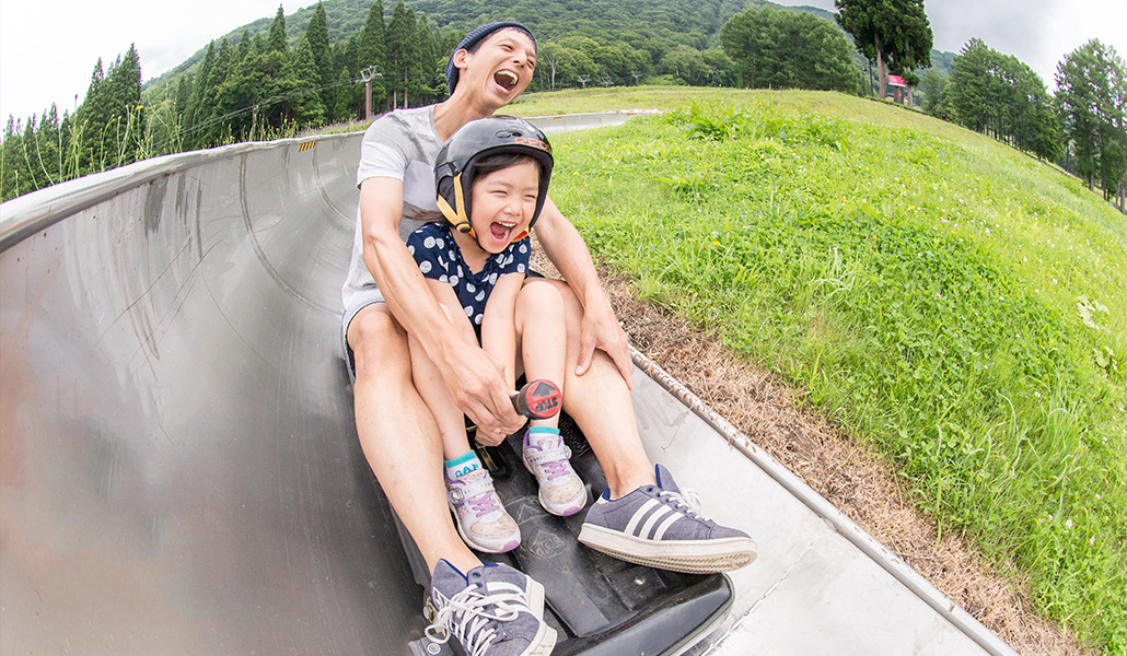 全長約500mの溝のコースを、ブレーキと体重移動を駆使しながら、颯爽と斜面を滑りおります。 その爽快感はヤミツキになるほど。 もちろん、ゆっくりと黒姫山や斑尾の景観を楽しみながらもOK。 ラベンダーの季節には花畑の中を抜けて行きます。