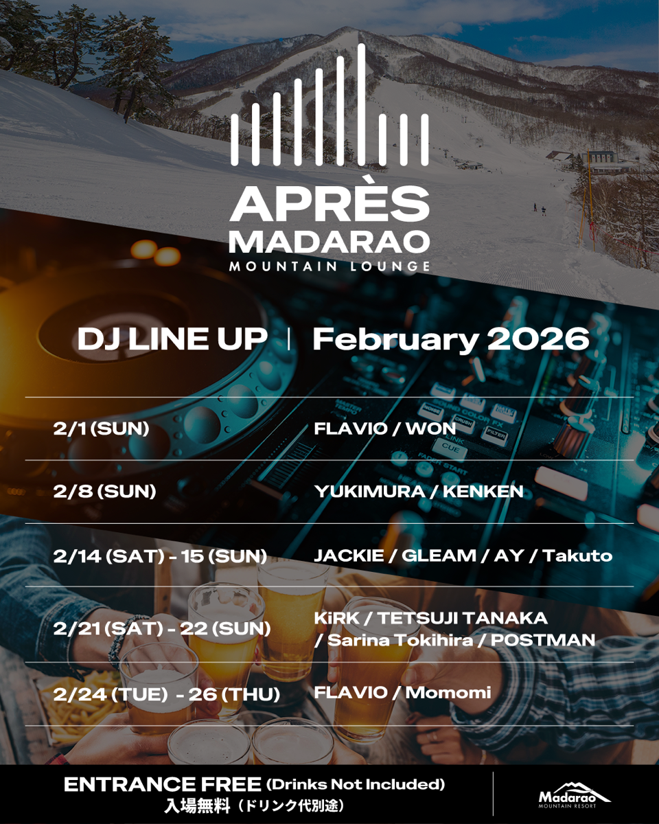 ゲレンデボトムエリアのメインレストラン「レストラン ハイジ」にて、期間限定のラウンジエリア「Après Madarao Mountain Lounge(アプレ・マダラオ・マウンテン・ラウンジ)」がオープン。
