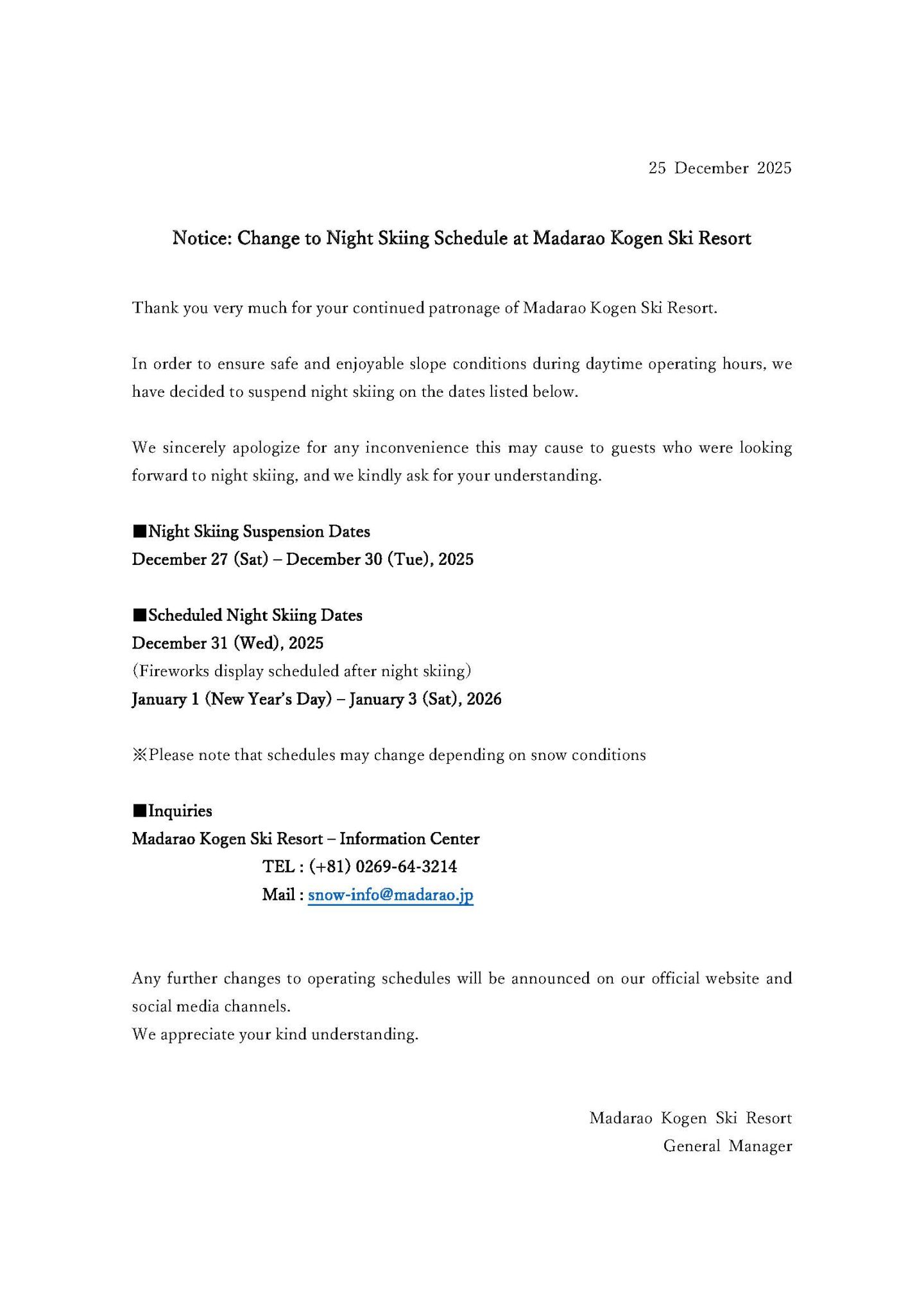 Notice: Change to Night skiing schedule at Madarao Kogen Ski Resort【PDF】
