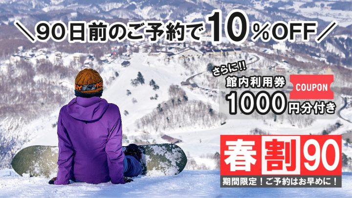 【3月限定・春割90】10%OFF+館内利用券1000円付き|春スキー超先得プラン!